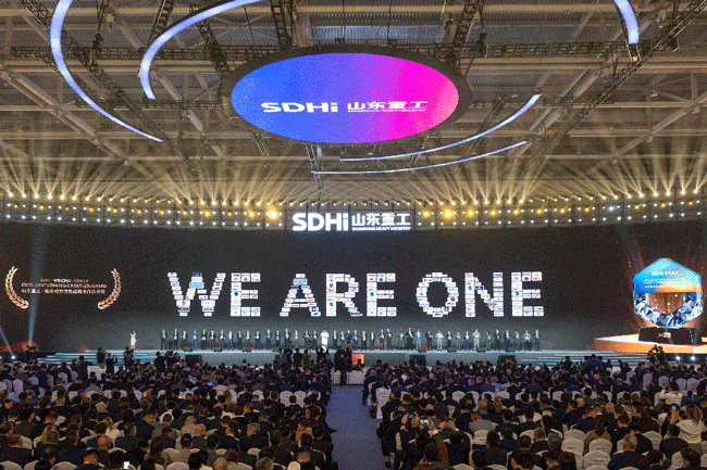 大会正式发布山东重工全球品牌标识,任刚、满慎刚、王志坚和战略合作伙伴代表、海外员工代表共同为品牌标识揭幕。